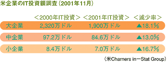 一方、投資調査会社チャーナースは01年米企業のIT投資は前年比で企業規模を問わず軒並み2ケタ減になったと発表し、ITメーカートップの顔面は蒼白になったと同社のローバート・ブルー会長は語る。「大企業は18.1%減、中堅企業は13.0%減、小企業は16.7%減」。これがチャーナースの発表だ。
