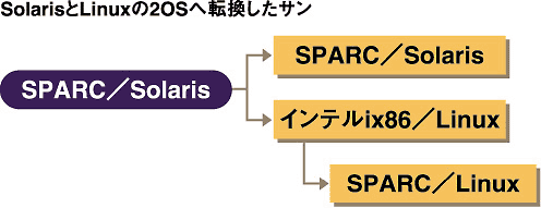 サンはこれまで自社OSのSolarisも自社チップSPARCだけのシングルアーキテクチャを強調して、数十種のOSを使うIBMを激しく攻撃し、企業データセンターからIBMメインフレームを追放することに全力を傾けてきた。このサンが遂にシングルOS戦略を放棄して、SolarisとともにLinuxもOSに加えることになった。サンは02年2月にインテルチップx86にLinuxを載せたサンブランドサーバーを発売する計画を公表した。