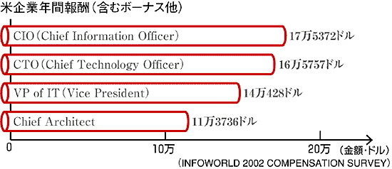 さて一般的に社内の地位と報酬は大きな関係がある。同調査によると、CIO報酬額は会長、CEO、社長、CFO、CTO(最高技術責任者)に次ぐ高額となった。ボーナス、利益配分を除く平均サラリーは01年、CTO14万3802ドル、CIO14万184ドルでこれにIT担当副社長12万5375ドル、チーフアーキテクト10万4873ドルが続く。