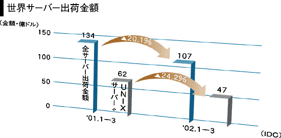 サーバーはパソコンに比べ単価が高いため、価格デフレの影響度が大きい。とくにサーバーでも単価がインテルサーバーの約10倍のUNIXサーバーの価格破壊が激しく、台数は微増したにもかかわらず、出荷金額は前年同期の62億ドルから24.2%減って47億ドルまで下がった。