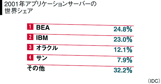 「01年にAppSvrベンダーはJava市場での自社プレゼンスを明確にした。さらに02年にはJava2エンタープライズエディションによるウェブシステム構築実績の勝敗が明確になる。この競合に勝ち抜くためAppSvr機能強化の競合が激しくなった」AppSvr市場で無気味な存在はマイクロソフトだ。同社はAppSvrシェア争いにも顔を出さず、BEA、IBM、オラクル、サンの競合を静観しているように見える。