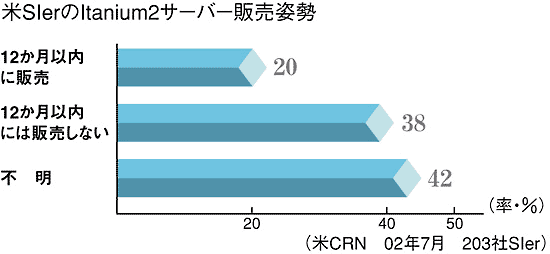 米HPはIt.2サーバーを発表したが、当面量販は期待しないと同社グローバル・チャネル責任者J.ギア氏は次のように語る。「当面、米SIerはIA-64サーバーでは量販を狙わず、付加価値の大きな特定ビジネスアプリケーション市場開拓を目的とする。わが社はサンの64ビット・ローエンドサーバー販売実績の多いSIerがサンからインテルに乗り換えることも狙ってIt.2サーバーを発表した」米国チャネルのIt.2サーバー販売への対応も二手に分かれる。米CRNの203社SIer調査によると、1年以内に同サーバー販売を開始するとの回答は20%に過ぎず、逆に1年以内には販売開始しないとの回答は約2倍の38%に達し、42%は不明と答えた。
