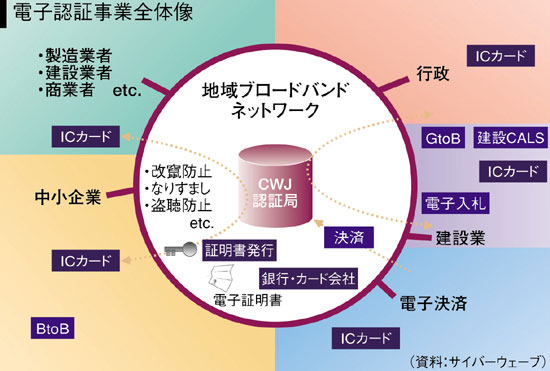 電子認証事業の新しいメニューとして来年からサービスを開始するのが、公共工事の電子入札対応の電子認証サービスだ。国土交通省が昨年11月から開始した電子入札では帝国データバンクだけが電子認証サービスを提供しているが、地方自治体向けに開発された「電子入札コアシステム」に対応した電子認証サービスは、CWJを含む8社が認定され、サービス提供を開始する。「基本的に8社は同じサービスを提供するので、価格以外にどのような付加価値のあるサービスを提供できるかがポイント。中部地区で認定されているのはCWJだけなので、地元での利用拡大をめざしたい」。CWJが発足して2年、地域に密着しながら着々と経営基盤の拡大を進めている。(ジャーナリスト 千葉利宏)