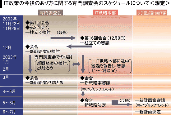 e-Japan戦略の見直し作業が本格的にスタートした。先月22日、IT戦略本部の下に新しく設置された「IT戦略の今後の在り方に関する専門調査会」の初会合が開かれ、IT戦略本部から参加した出井伸之ソニー会長、鈴木幸一インターネットイニシアティブ社長、村井純・慶大教授の3人に加えて、総勢17人の委員が集まった。