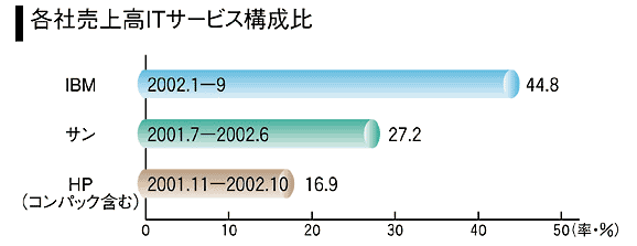 ヒューレット・パッカード(HP)はコンパック買収を契機に、サン・マイクロシステムズはマネジドサービスを中心に、それぞれITサービス強化を打ち出した。両社の最強競合となるIBMのサービス売上構成が45%(02年1―9月)と高いのに対し、サンは27%(02年6月)、HPは17%(02年10月)とこの構成比が低いのが理由だ。これからのIT市場牽引力は、サービスであるのは衆目の一致するところだ。データクエストによると、06年世界ITサービス市場は6000億ドル(72兆円)。マネジメントサービスだけでも2260億ドル(27兆円)と巨額に膨らむ。ハード利益率下落を支えるにはサービス以外の期待分野もない。サンは「自社ハードとマネージドサービスの組み合せを強化し、提供するユーザーITバリューの向上を狙う」と宣言した。