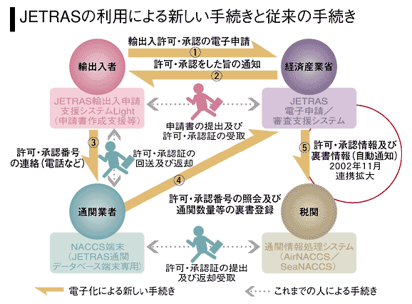 行政手続きのオンライン化は、03年度から本格化する見通しだが、JETRASによる輸出入許可・承認の電子申請はすでに2000年4月からスタートしている。さらに、行政手続きの効率化という観点から、所管官庁をまたがってシステム連携が実現した。電子政府によって行政手続きのワンストップ化などの効率化が必要と指摘されるなかで、先駆的なプロジェクトと評価することができるだろう。