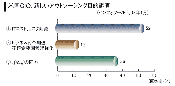 IBMの新サービスに対して多くの米国エンタープライズCIOは「われわれはまだIBMサービスにコミットしたわけではない」と語り、そのサービスのもたらすメリットを分析中であることを示唆する。しかし、金融大手JPモルガン・チェイスは7年間で50億ドル(6000億円)の基本料金で、IBMとオン・デマンド利用を契約した。「最近では米国エンタープライズが共通的にアウトソーシングする狙いを徐々に変化させていることに留意すべきだ」とメリル・リンチのCTO、ジル・ミューレン氏は語っている。米インフォワールド誌のアウトソーシングの目的に関するCIO調査でも、従来の「ITコスト削減」や「経営資源をコアビジネスに集中する」のに加えて、「市場の変化に迅速に対応する」32%、「ビジネスプロセスに集中する」66%、「ITコスト削減」61%、「社内にないIT機能を利用する」52%、「システム上のリスク軽減」43%が目的の上位を占める(複数回答)。「リスク軽減」目的の回答が増えているのも最近の傾向だ。