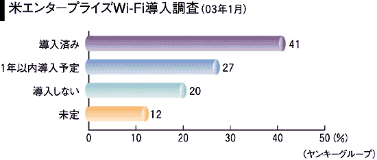これまで米国では、ワイヤレスLANの標準規格(Wi-Fi)に関してセキュリティや信頼性、既存システムとの相互運用性などの課題が指摘されていた。このため、ワイヤレス関連ベンダーは、長い時間をかけて問題解決に当たってきた。これにより2002年中盤からは、米国エンタープライズ市場でWi-Fi需要が急速に高まってきた。03年1月のヤンキーグループの調査では、米大企業の41%がすでにWi-Fiを導入し、今後1年以内の導入予定は27%となっている。米誌インフォワールドによるCIO調査でも、導入済みが42%、今後6か月以内の導入予定が33%で、いずれも高い数字となった。