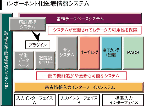 「コンポーネント化・モジュール化が進めば、ベンチャー企業でも電子カルテシステムの開発に参入しやすくなる。ベンチャーらしいきめ細かな気配りで医療機関が使いやすいモジュールが提供されることが期待できる」(武末文男・厚生労働省医政局研究開発振興課医療技術情報推進室室長補佐)。コンポーネント化はITベンダー間の競争を促進し、中小ベンダーにビジネスチャンスを提供するという狙いもあるようだ。標準的電子カルテシステムの構築に向けて、今月中には、産・官・学・民によるプロジェクト推進体制も固まり、開発がスタートする予定である。