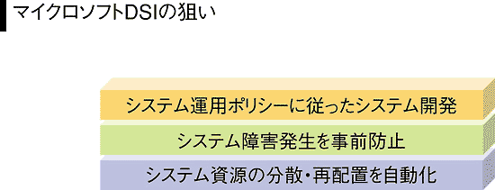 これに対しマイクロソフト・サーバー・グループのボブ・オブライエン・マネジャーは次のように解説する。「IBMなどのアプローチは、システムを外部から観察して、欠陥発生を認識しそれを治療する考え方だ。これに対しわが社のDSIは、既設IT環境と自動的に協調して稼動するアプリケーションを事前開発するという、より予防薬に近い考え方である。従って、DSIはIBMなどの機能と発想原点が異なる」