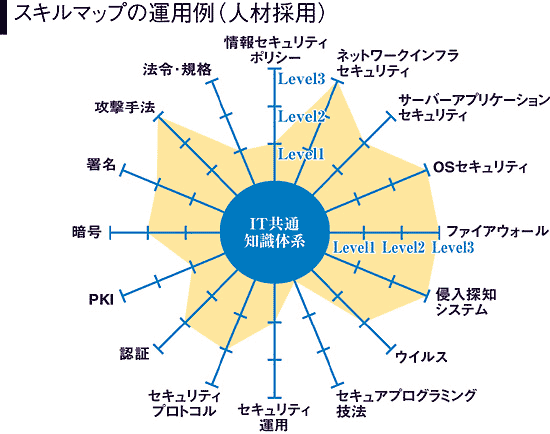 さらに、セキュリティ確保の必須業務が明確に定義されていないため、どのような対策を講じれば良いのかわからないとの声も聞かれた。こうした問題を解決するための基盤として「情報セキュリティに関するスキルマップ」(図)が作成された。セキュリティに携わる人材に求められる技術、知識をまとめて体系化したもので、全体を16のカテゴリーに分け、それぞれのスキルレベルを3段階に分けてレーダーチャートに表示する仕組みだ。ユーザー企業や地方自治体が人材募集を行う場合も、まず業務に必要なセキュリティレベルをレーダーチャートに書き込み、そのチャートの形に一番近いスキルをもった人材を採用すれば、人材のミスマッチも防げるというわけだ。