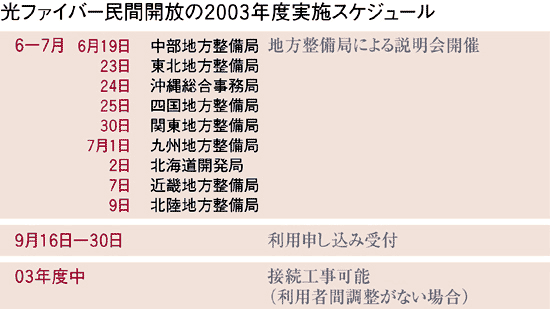 国土交通省は、前年度に引き続き河川・道路管理用光ファイバーの民間開放を実施する。今月から順次、地方整備局での説明会をスタート。今年度は、2割増の約1万2000kmを対象に、9月に利用希望者の募集を行う計画だ。当初は民間側からの強い要望で実施されることになった光ファイバーの民間開放だが、実際に制度がスタートする段階では、NTTや電力各社が管理する光ファイバーの開放が進み、注目度も少々冷めてしまった面もある。それでも初年度は約1万kmの光ファイバーを開放して約1700kmの申し込みがあった。「初年度だったことを考えれば、決して少なかったとは言えないでしょう」(中込淳・総合政策局事業総括調整官室調整官)。確かに国有財産である光ファイバーを民間が利用するための制約条件がいろいろとある中で、開放区間の約2割弱の申し込みがあったわけで、まずまずの滑り出しと言えそうである。申し込み状況を地域別に見ると、関東地方整備局の管轄が400kmで最も多く、次いで北海道開発局の300km、北陸、四国、沖縄が200kmと続く。東北地方整備局の管轄だけは申し込みはゼロだったが、全体的にみると、北海道、沖縄、四国など地方での申し込みが相対的に多かった。