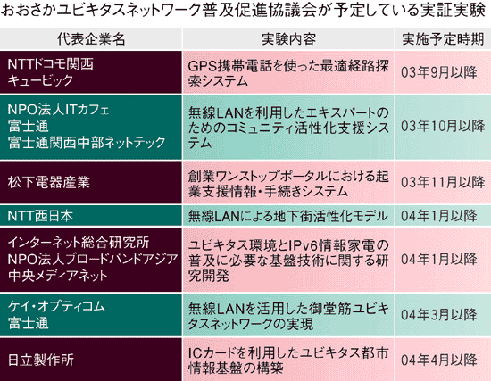「おもろい仕組みを作れば、食いついて、乗ってくるのが大阪人。そんな取り組みを期待したい」――。協議会会長に就任した中野教授は、「御堂筋」発の新しいITサービス実現への意気込みをそう語る。これまでに日立製作所など大手ITベンダーだけでなく、NPO(民間非営利組織)法人なども参加して7つの実証実験(=表)の準備が始まっている。
