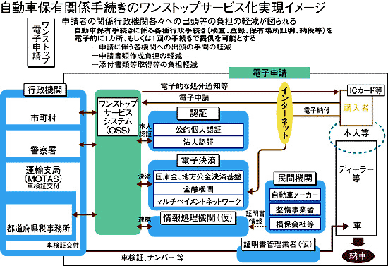 複数の役所にまたがる面倒な行政手続きをITの利活用で一度に行えるようにするOSS。自動車保有関係手続きも、車庫証明は警察署、登録手続きは運輸支局、自動車税納付は都道府県税務事務所へと足を運ぶ必要があるため、OSS導入が01年3月に策定されたe-Japan重点計画に盛り込まれ、本格的な取り組みがスタートした。国土交通省では、02年8月にOSSの全体像をまとめた「グランドデザイン」を策定して、NTTデータにシステム基本設計を発注。今年4月にOSSの「要件定義の概要」をまとめて、自動車メーカーの完成検査終了証、損保会社の自賠責保険証明書など民間機関が交付する証明書も含めてワンストップ化する方針を明確化。これまでの自動車保有関係手続きは、自動車を購入した販売店に手数料を支払って代行してもらうことが多かったが、OSS導入でどう変わるのか。「基本的には販売店の端末を使って電子申請を行うケースを想定している」(猪股博之・国土交通省自動車交通局技術安全部管理課専門官)。オンライン化で購入者が自宅のパソコンからでも電子申請が可能になるが、自動車購入時や、検査時に行う手続きが多く、タイミングや手間を考えると、販売店の担当者のアドバイスを受けながら販売店の端末を使って利用されるというイメージとなる。紙の申請で捺す印鑑の代わりに、“電子印鑑”である公的個人認証や法人認証を購入者が取得していることが利用の条件だ。
