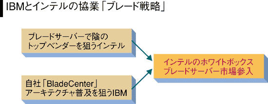 この代表としてはシンサーバー、ブレードサーバーがあるが、徐々にブレードサーバーの出荷が増えている。インテルはブレードサーバーで、ホワイトボックスとOEM市場の席巻を狙う。このためインテルは、ブレードサーバー「BladeCenter」を開発したIBMと技術提携を行い、インテルはブレード業界標準を狙ってブレードを構成するXeonベースボード、シャーシ、マネジメントソフト、ネットワークスイッチなど部品すべてをホワイトボックスビルダーやOEMerへ供給を開始した。ガートナーもブレード市場が大きくなるとの報告を発表している。ガートナーのアナリスト、ジョージ・ワイス氏は「ブレードがスケールアウトの主力サーバーになるには、IAのメインストリーム技術を豊富に取り込む必要がある。そこでインテルが、IBMアーキテクチャを基盤に自社技術を結集してブレード市場に間接参入すれば、IBM・インテル・アーキテクチャが間違いなく当市場の標準になる」と語る。