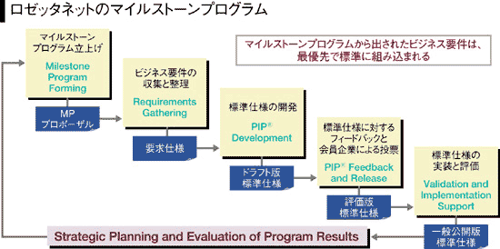 ロゼッタネットは、新たなSCMモデルを実現したい人(ロゼッタネットに参画する企業や団体)の提案(ビジネス要件)をもとに、そのSCMモデルに合った標準化を優先的に進めている。この仕組みをマイルストーンプログラム(MP)と呼んでいる。また、このMPに提案されたSCMモデルは、参照モデルとしてロゼッタネットより提供される。