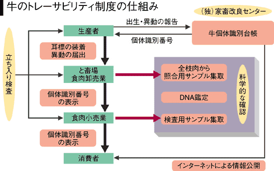 農水省では、今年7月に、食糧庁を廃止する一方で、食のリスク管理と消費者行政を担当する新組織「食品・安全局」を設置したばかり。この消費・安全局の衛生管理課(牛トレーサビリティ監視班)が、牛トレーサビリティ制度の構築・運用を担当。耳標や個体識別番号の管理から個体識別システムの運営までの実務は、独立行政法人家畜改良センター(福島県西白河郡)に委託する。現在、日本の牛の生産者は約13万戸。うち3万戸強が乳牛を扱う酪農家で、残り10万戸弱が肉用牛農家。肉用牛農家のうち約8割は子牛を生ませて売ることを主とした繁殖農家で、子牛などを買って商品に育てるのが肥育農家だ。国内では約450万頭の牛が飼われ、年間130-140万頭の牛が出生し、ほぼ同数がと畜場に搬入される。