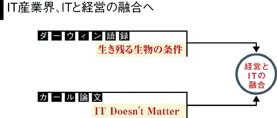 このカール論文があらためて「経営のITの完全融合」は、ベンダー、ユーザーが共通にもつべき次世代ITシステムの最も喫緊の課題だという認識を定着させた功績は大きいといえるだろう。同時に日米では、現行IT問題点として、「部門最適化システムの集合が全体最適ソリューションになり得なかった事実」を経験した。このため経営層によるITガバナンスを強化する「EA(エンタープライズアーキテクチャ)」も日米で大きな注目を集める。IT不況をきっかけにして、「ITと経営の融合」という古くて新しい課題に日米有力ベンダーが挑戦する時を迎えた。(中野英嗣●文)