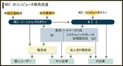 NECのパソコン事業は、他社に先駆けてた全国販売網の構築でトップシェアを獲得した。この販売網の広さがマイナスに働いたことから、01年、03年に販売体制を整理統合したのである。