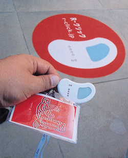 R-クリックは、0.7秒に1回、電波を自動発信するほか、会員がクリックボタン(意思表示ボタン)を押した時にも電波を発信する。六本木ヒルズの12か所に、無線アンテナを設置したスポットが配置されており、R-クリックをもった会員が六本木ヒルズに入っていくと、自動発信電波によって誰が六本木ヒルズを訪れたかを検知する仕組みだ。森ビルでは、電子マネー機能の付いたICカード「コミュニティパスポート」の無償配布を積極的に進めている。名前、住所、年齢、性別、六本木ヒルズ内で働いている人かどうかなどの属性情報やパソコン、携帯電話のメールアドレスなどが登録されており、R-クリックのモニターもコミュニティパスポートの登録メンバーが対象。実験では六本木ヒルズで働いているかどうかと性別で属性を4つに分類、時間帯も午前、午後、夕方、夜の4つ分けて、属性と時間帯に応じた情報を提供する。R-クリックサービスは、3種類を用意。六本木ヒルズに配置された12か所のスポットのうち、地面に赤い目印が張られた10か所の近くで、R-クリックのボタンを押すと、メールが送信されてくる「ここだけクリック」。プラズマディスプレイの情報掲示板が設置されている2か所のスポットで、ディスプレイに表示された情報が欲しい時にR-クリックを押すとメモ代わりに情報を転送してくれる「みてとるクリック」。モニター会員が六本木ヒルズに来たことが検知されてR-クリックを押さなくても勝手にメールが配信されてくる「ぶらっとキャッチ」の3つである。
