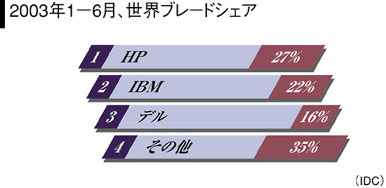 IDCは、03年に世界出荷台数で20万台、金額で6億ドル(720億円)のブレード市場は、07年には10倍の62億ドル(7400億円)になると予測している。多くのUNIX主体のソリューションプロバイダ(SP)は「UNIX、Linuxでもサーバーコンソリデーションによって、1台のラックやシャーシに収まるサーバー群で、複数アプリケーションを処理する動きが強まっている。従って、IBMのUNIXブレード市場も大きくなる」と期待する。世界的にUNIXサーバー市場は大きく落ち込んでおり、特にトップのサン・マイクロシステムズ、第2位ヒューレット・パッカード(HP)の、この売上高はともに2ケタ落ち込む。これはウィンドウズサーバーに浸食されているからではなく、インテルベースのLinuxサーバーに市場を奪われているからだ。しかし、IBM「pSeries」は、台数、金額ともに直近は2ケタの伸びを示す。これはIBMの大・中型UNIX、Linux兼用のPowerチップサーバーが、サン、HPのリプレースに成功していることによる。