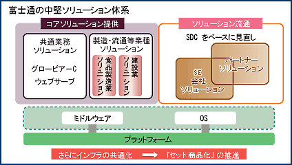 富士通は10月1日、同社の強みである地域に根ざした企業向け「ソフト・サービス事業」を強化するため、本社に全国の「富士通パートナー」約700社を支援する150人体制の「中堅市場ビジネス本部」を新設した。「従来以上にパートナーを当社のメインプレイヤーに成長させる」(堀切達也・中堅市場ビジネス本部本部長代理)のが目的で、7月に発表した従来のパートナー向け支援策を再構築・体系化した「ソリューションバリュープログラム」に厚みをもたせる作業を急ぐなど、パートナー戦略を本格化させている。このプログラムではまず、同社が提唱するミドルウェアやOSなど共通化したプラットフォームのIT基盤「トリオーレ」上に、パートナー各社の業種パッケージやオリジナルサービスなどを組み合わせた「セット商品化」を推進する。そのために共通の「コアソリューション」としては、中堅ERP(基幹業務システム)ソリューション「グロービア-C」や中堅企業のシステムインテグレーションを本格的にウェブ展開するための「ウェブサーブ業種ソリューション」のほか、保守・運用サービスの「サポートデスク」、業種別のシステム導入ソリューションを体系化して提供する。