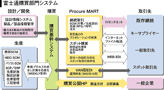 具体的には受発注、所要(需要)提示、納期回答といった部分にロゼッタネットを活用した。サプライヤーとの連携として、01年12月より国内外10数社(京セラ、インテル、マイクロン・テクノロジー、シスコシステムズなど)と運用を開始している。ロゼッタネットでは、見積依頼から検収までといった調達業務プロセスが実現できる。このため、ロゼッタネットは1つの体系の中で様々なビジネスプロセスに適用できるというのが最大の利点である。なお、当社のネット調達システムは他にもウェブ-EDIをはじめとした数種の電子商取引をサポートしている。これらはウェブを利用したシステムであり、当社ではこのBtoBシステムをASPとしても提供している。