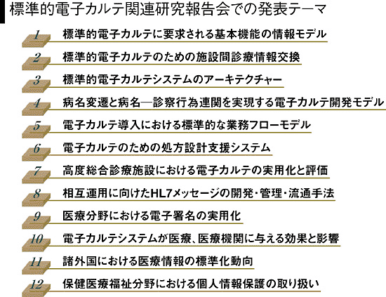 厚生労働省では、2001年12月に「保険医療分野の情報化に向けてのグランドデザイン」を公表し、電子カルテの普及に向けた事業をスタートしている。しかし、標準化を含めて電子カルテ導入の基盤はまだ十分に整っていないのが実情だ。このため今年4月から標準的な電子カルテに関する研究をスタートするとともに、研究途中の成果も積極的に情報公開していくことで電子カルテ導入も促進していくことにした。11月には医療分野のIT化について厚生労働省と経済産業省が緊密に連携していくことが局長レベル会合でも合意され、セキュリティなどの分野で協力が進むという。報告会で発表された研究テーマは12(表参照)。内容は非常に多岐に渡る。まず1では、電子カルテに必要な機能は何か、それらをどう連携するかなど情報モデルの検討が進められている。情報モデルの調査・分析を行うために「業務フローに対応する機能」、「情報管理における法律的要求事項」、「診療記録として必要な情報」など8つの視点を設定した。この情報モデルや、国際標準HL7(医療情報交換のための標準規約)の動向を踏まえながら、電子カルテの機能モデルを開発していく。5では、現在の業務フローを分析した上で、電子カルテ導入によって実現できる新たな業務フローモデルの検討を進めており、3で、このモデルに基づいた電子カルテを開発するフレームワークの開発をめざしている。