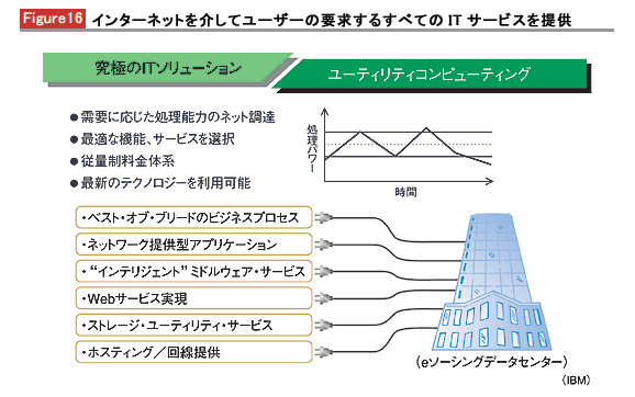 米国ではIT投資を日常的・固定支出と、戦略的投資に分けて考えることが一般的だ。とくに多くのIT投資調査は、全IT支出に占める戦略的投資の割合いの高いことが企業業績向上につながっていることを教える(アクセンチュア)。従って戦略的な投資資源を捻出することは企業にとってきわめて重要だ。さらにこのAMSが発展すると、究極のITサービスといわれる従量課金制のユーティリティコンピューティングに収束するとIBMは説明する(Figure16)。