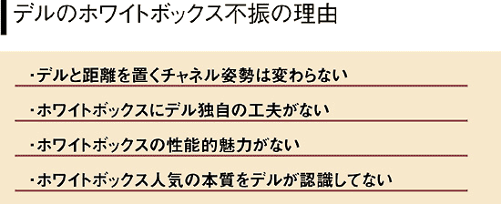 米国パソコン市場ではデルとホワトボックスがともに30%程度のシェアを握っており、このホワイトボックスをデルが提供することで、デルの実質シェアを圧倒的に高めるのがデル会長の狙いだった。しかし、米国業界が予想したように、デル戦略に賛同するソリューションプロバイダ(SP)は極めて少なかった。デルのジム・シュナイダCFO(最高財務責任者)は、「ホワイトボックスにデルが注力したわけではない。この戦略は今後もいくつかの市場セグメントで実験を続ける。当社のホワイトボックスは成功したとはいえないが、デルの本命であるデルブランド市場を浸食したという実害もなかったからだ」と語り、1年前とは様変わりのトーンダウンぶりである。デルのホワイトボックス戦略を聞いた多くの米SPは、当初はSPの顔でSMB市場へデル製ホワイトボックスを販売させ、追加のプロセスでデル直販によるデルブランド品への切り換えを危惧した。さらにデルのホワイトボックスはデルブランド市場でのカニバリズム(共食い)を起こさないよう、例えばバス性能も劣り、価格的にも魅力の小さな商品だった。デルにとってみれば、デルブランド市場での競合を起こしては、戦略的意義がなくなるからだ。あるSP経営者の1人は言う。