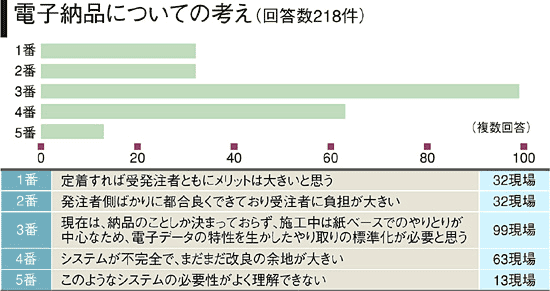 「ペーパーレス化」もあまり進んでいないようだ。電子納品した成果物の検査のために、電子納品した書類をプリントアウトして紙でも提出することを求められた現場が6割を上回った(回答数109件)。電子データで作成した書類を紙に打ち出さずにパソコン上で検査した現場はわずか4%(同125件)。検査する側が画面上でのチェックに慣れていないためと考えられる。