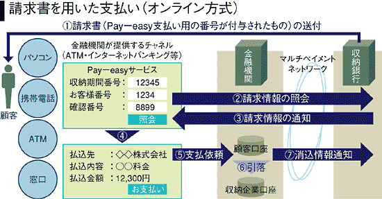 マルチペイメントネットワークは、公共料金、税金などの収納を行う収納企業・官公庁・地方自治体と金融機関を結ぶネットワーク基盤として、2000年5月に設立された日本マルチペイメントネットワーク推進協議会(JAMPA)が検討を進めてきた。01年10月からNTTドコモやみずほ銀行など一部の民間企業が個別に運用を開始し、国庫金の取扱開始とともに、利用可能な金融機関が一気に1200以上に拡大。本格普及の環境が整った。ペイジー収納サービスは、マルチペイメントネットワークと接続した金融機関のインターネットバンキングを使える環境があれば、簡単に利用できる。郵送された請求書で納付する場合、まずインターネットバンキングに接続し、顧客番号などを入力して収納機関に照会。画面上に請求データを呼び出して内容を確認後支払いボタンをクリックするだけで支払いが完了する。