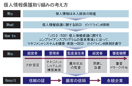 個人情報保護取り組みの考え方を図に示す。個人情報保護はコンプライアンスであるので、社長およびリスク担当役員が中心になった企業単位の活動でなければならない。一般に、個人情報保護のためのマネジメントシステムの構築に3-4か月、運用開始してからプライバシーマーク(Pマーク)取得まで更に数か月かかるので、すぐに計画を立てることが望ましい。