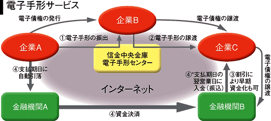 信金中金では実用化に当って信用金庫の取引企業の利用が見込める手形サービスに焦点を絞り、用語や使い勝手を紙の手形に似せることで違和感なく利用できる仕組みを構築した。使い方も図に示すように、支払情報の受取人B社がこの「情報」をC社に転送すれば、裏書譲渡と同じとなり、譲渡人C社が期日前にこの「情報」を金融機関に転送すれば、手形割引のように早期の資金化も可能となる。さらに500万円の手形を100万円ずつ5枚に分割するといった紙では不可能だった使い方もできるようになった。