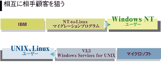 さらにIBMは、NTベースのマイクロソフト・エクスチェンジを、Linux上で走るLotus(ロータス)へ移行するプログラム「Move2ロータス」の提供を開始した。これによってOSをNTから移行すると同時に、ロータスも使えるようにした。一方、マイクロソフトもIBMのLinux攻撃に対抗する「ウィンドウズサービス・フォーUNIX」の新版3.5を正式にリリースした。これでIBMなどのUNIXサーバーアプリケーションのマルチスレッティング機能も提供する。