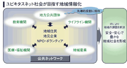 例えば、定点設置したウェブカメラで撮影した自然災害などの映像情報をリアルタイムで見る場合、ブロードバンド接続されている地元自治体では見ることができても、ブロードバンド連携していない国の防災担当や他の自治体関係者がリアルタイムで映像を見ることができない問題点も指摘されている。公共ネットワーク構築もどのようなアプリケーションで利用するのかを意識していく必要があり、今後の多様なアプリケーション展開を予想すれば「ユビキタスネットワーク」の実現は不可欠だ。