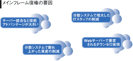 しかし、この移行は分散化によるIT資産増大と、管理要員と管理コストの増加を招いた。投資対効果(ROI)の追求やTCO(所有総コスト)削減ムードの高まりは皮肉にも、メインフレームの役割をユーザーに再認識させた。ネットビジネス環境で許されないシステムダウンに対するメインフレームの誇る堅牢性もユーザーは強い関心を示した。IDCのエンタープライズシステム・アナリスト、スティーブ・ジョセリン氏も次のようにいう。