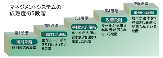マネジメントシステムには、一般に成熟度が存在する。成熟度は通常5段階に分けられる。各段階は、(1)初期段階:個別対応の段階、(2)手順制定段階:主要なルールができて利用された段階、(3)手順定着段階:ルールが各所に行き渡り、管理され、定着した段階、(4)改善段階:ルールが見直され改善が図られている段階、(5)最適化段階:効率が追求され最適化が図られている段階──のように定義できる。