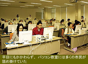 研修室では、パソコン教室が開講されている。平日の午前中という時間帯でも、高齢者から主婦、若者まで様々な年齢層の市民がパソコン研修に訪れている。「他の自治体ではパソコン研修が廃れた、という話も聞くが、塩尻市では毎回数10人の受講者で盛況だ」と金子係長。市民がIT化に熱心なのは、インターネットインフラが整備されていることも影響しているようだ。