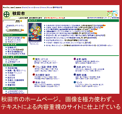 特徴は、テキストによる内容を中心とし、1ページで表示するデータ量が50KB以内と軽いこと。北嶋英樹・秋田市企画調整部情報政策課情報化担当主席主査は、「市役所のサイトは若者から高齢者まで、秋田市民すべてが訪れることを想定しなければならない。しかも、アナログ回線で接続している市民も考慮する必要がある」と、データ量を極力軽くした理由を語る。