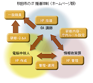 もちろん、職員が簡単にホームページを作成できる〝説明書〟を策定したからといって、各課が自発的にホームページを作るとは限らない。そこで、秋田市では各課にITリーダーを配置するために「電脳中核人」の制度を採用し、ITに関わる人材育成に力を注いでいる。