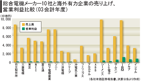一方、日本のIT産業は、収益力をみても「強さ」を発揮するにはほど遠い状況が続いている。経産省が04年10月に公表した政策ペーパー「情報家電産業の収益力強化に向けた道筋」でも、現状のままでは価格競争の激化による収益悪化が避けられないと指摘していたが、今年に入るとソニー、富士通などが相次いで業績下方修正を発表するなど脆弱な経営基盤を露呈した。最近のビッグニュースで、堀江貴文社長率いるライブドアのニッポン放送株取得は、ITと放送の連携による新しいビジネス戦略の可能性を期待させる出来事。昨年話題となったプロ野球問題と同様に、IT企業との連携で放送ビジネスがさらに「強く」なる可能性があるなら提携を前向きに考えていく必要もあるだろう。