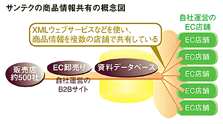 サンテクが運営するコンシューマなど14の一般顧客向けのECサイトでは、2004年初めから商品情報を蓄積している「資料データベース」からXMLウェブサービスを使って情報を引き出せるようにした。サンテクのECサイトのなかでIT商材を扱うサイトは多く、商品情報の基礎となるデータを引き出せるようにしたことで作業効率が大幅に改善したという。今後は、サンテクからIT関連商材を購入する販売店でも、この資料データベースからXMLウェブサービスを使って商品情報を入手できるよう検討している。