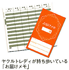 ヤクルト本社の商品群は、ヤクルトなどの飲料、サプリメントなど健康食品、化粧水などの化粧品と、主に3つの分野に及ぶ。商品点数は数百種類あり、売れ筋商品だけに絞っても200種類余りもある。これら膨大な商品に対する顧客の需要を書き記した「お届けメモ」をもとにヤクルトレディや化粧品を担当するヤクルトレディが定期的に顧客先へ届ける。