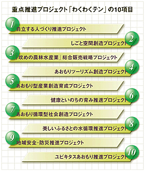 05年度の重点推進プロジェクトは、人材育成関連の「自立する人づくり推進プロジェクト」や農林水産関連の「〝攻めの農林水産業〟総合販売戦略プロジェクト」など10本の柱からなり、通称「わくわくテン」と呼ばれている。「ユビキタスあおもり推進プロジェクト」は、ITを活用したプロジェクトとして、わくわくテンの中に盛り込まれている。