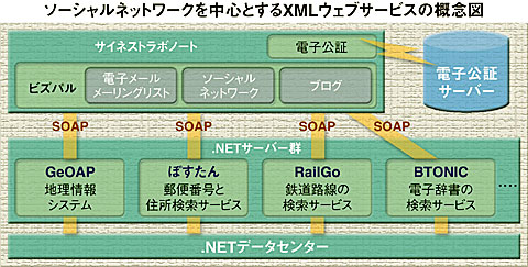 こうした考えに基づき、イーストは今年3月15日、ソーシャルネットワークを中核としたオリジナルのコミュニケーションサービス「ビズパル」を立ち上げた。ビズパルは、ソーシャルネットワークとブログ、電子メールを使ったメーリングリストの3つの要素を組み合わせた。ビズパルは、XMLウェブサービスの接続口を持っており、インターネット上にあるXMLウェブサービス対応のさまざまなサービスを取り込めるようにした。