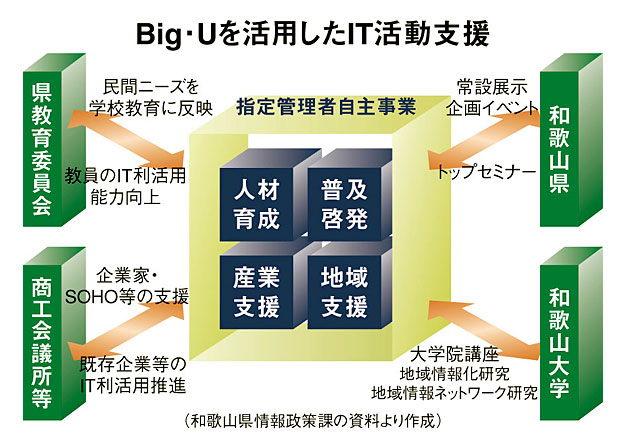 「県外から仕事を取ってくる」ための企業誘致促進に関し、和歌山県が期待するのは、今年から供用が始まった和歌山県立情報交流センター「Big・U(ビッグユー)」だ。県内では初めて指定管理者制度を採用した公設民営施設で、NPO(特定非営利活動)法人の和歌山IT教育機構が管理運営にあたる。和歌山大学も地域情報化をターゲットとした大学院講座を開設、「いくら助成制度があっても、人材供給できなければ企業誘致に結びつかない。指定管理者制度で効率的に(IT関連の)人材育成を進める」(高田課長)方針。安定的な人材供給がIT関連企業誘致を促進し、地場の情報サービス産業の活性化にもつながるという考えだ。