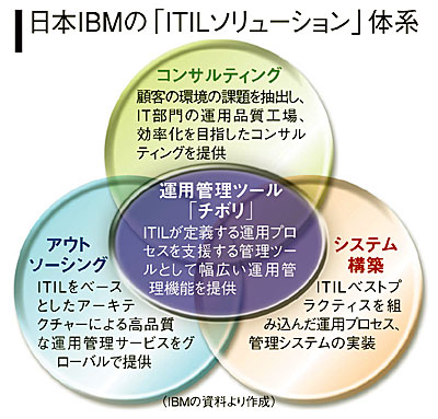 日本IBMのITILへの取り組みは、現状のシステムを診断(アセスメント)してIT部門の効率化を進言する「コンサルティング」、ITILのベストプラクティスを組み込んだ運用プロセスや管理システムを実装する「システム構築」、構築後の運用管理サービスを提供する「アウトソーシング」がある。この際、ITILが定義する運用プロセスを支援する管理ツールとして「チボリ」を提供している。
