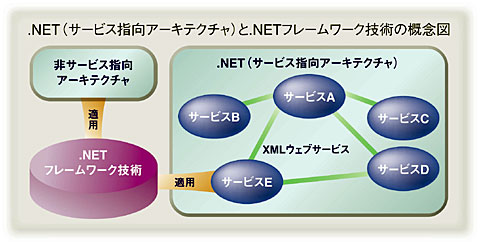 顧客の情報システムが高度化、複雑化するなかで、大規模な業務システムの開発は時間や資金が膨大にかかり、それだけにリスクも高まる。SOAでは、大規模な業務システムを密接不可分な1つの塊として見るのではなく、個別の業務を担うアプリケーションである「サービス」の集合と捉え、サービス同士をXMLウェブサービスなど標準的な接続方式でつなぎ合わせる開発手法を基礎とする。.NETフレームワークは、個々のサービスを開発する基盤としての役割を担い、これらをXMLウェブサービスで結びつけることで、まとまった1つの大規模システムとして機能させる。