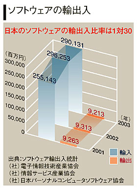 国内のIT産業の国際競争力の低さを端的に示しているのが、ソフトウェアの輸出入の比率である。2003年では輸入が約2900億円なのに対して、輸出はわずか約92億円。輸出と輸入の比率は約1対30と大きな開きがある。この差を縮めるには国内のソフトウェア産業の国際競争力を高めるしか方法はない。短期集中型の景気対策は、カンフル剤としての効果はあっても、国際競争力を高める抜本策とは言い難いのが現状だ。体質そのものを改善する“漢方薬”が求められている。